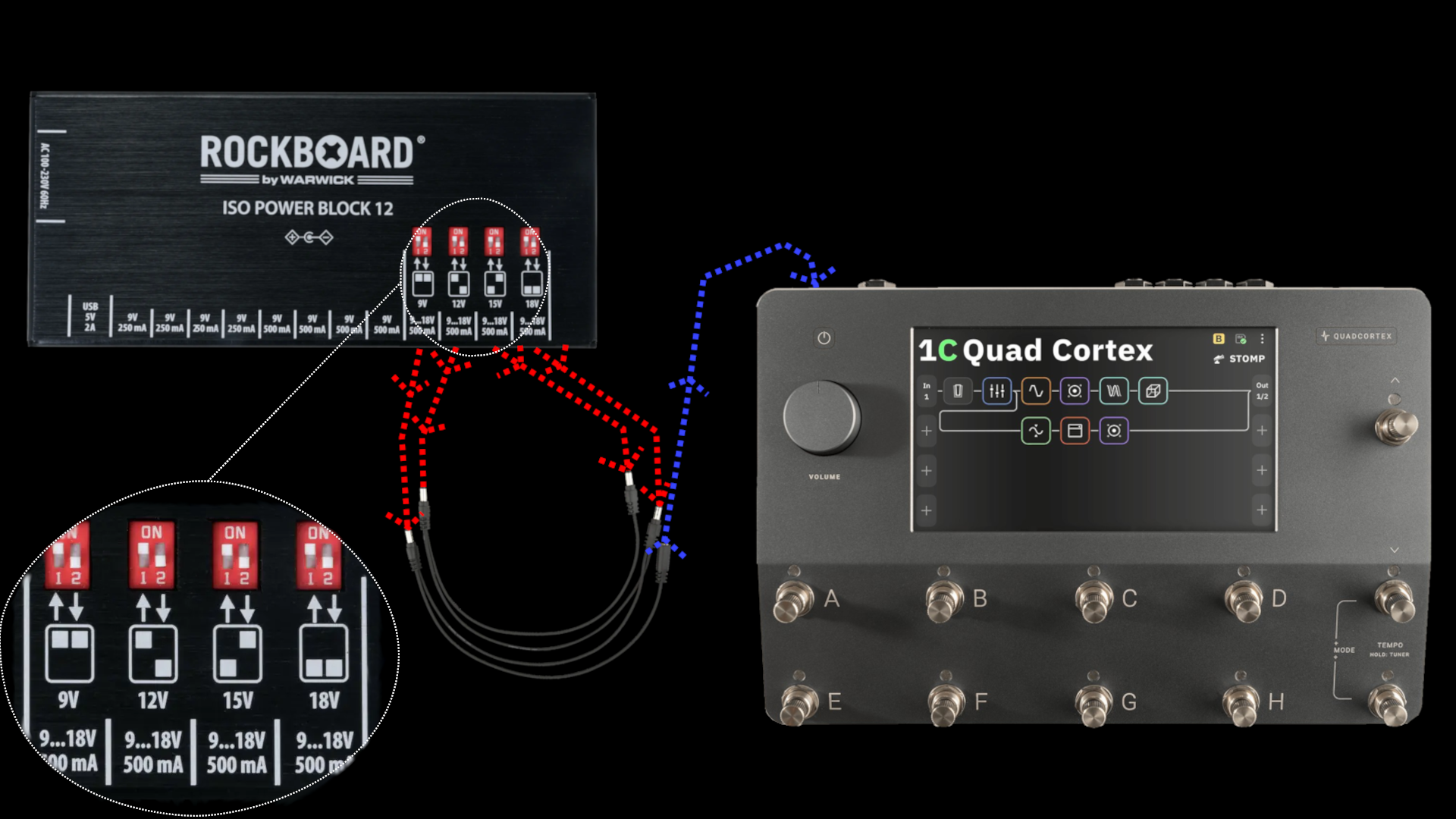 The Quad Cortex is specified by the manufacturer as requiring up to 3A of current. The following setup has been reported by users in real-world use. RockBoard has not independently verified this configuration for compliance with the manufacturer’s specification, and it may not be suitable for all units or operating conditions.